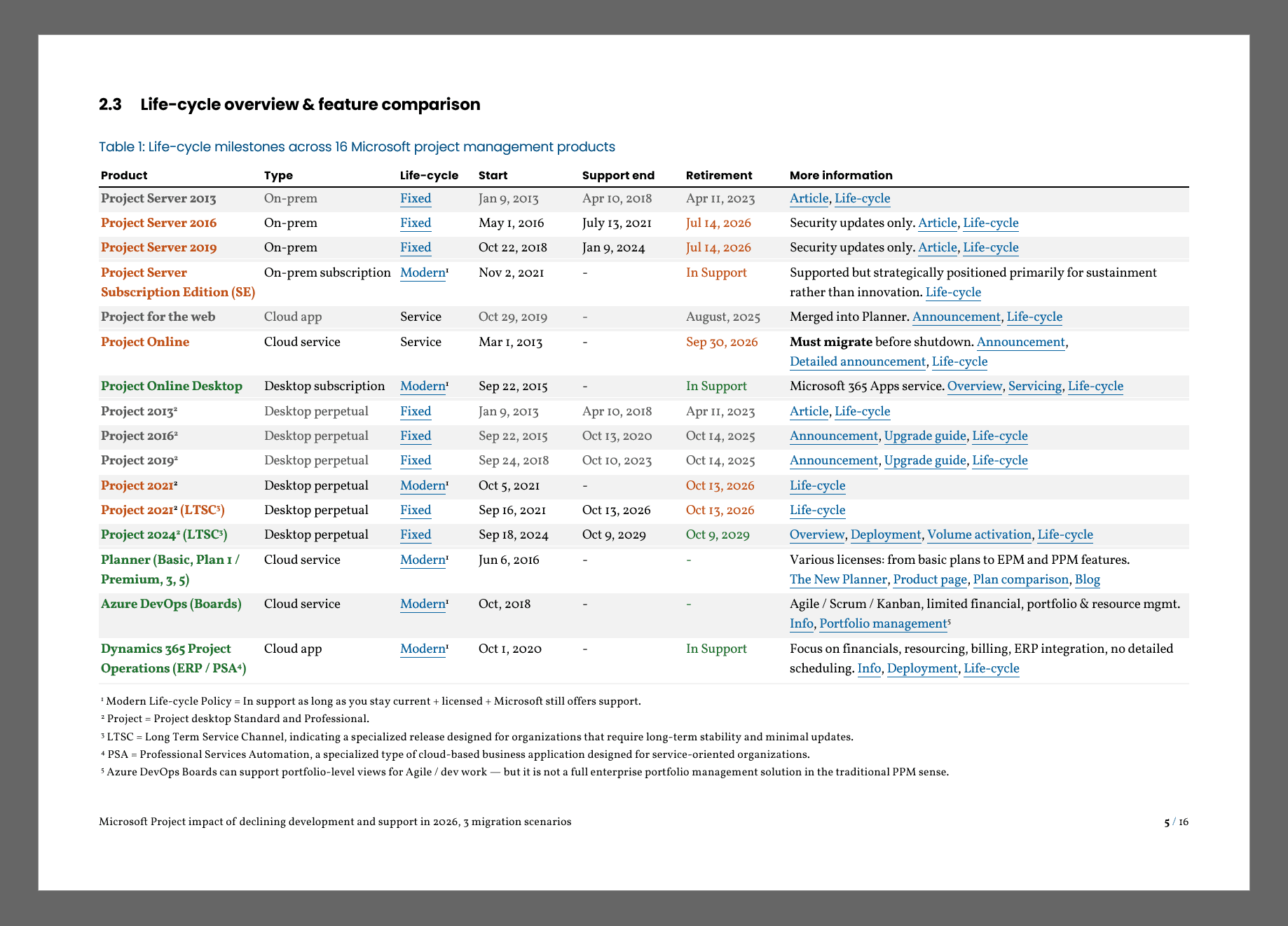 This life-cycle table – also included in the free whitepaper (no registration required) – makes the transition visible at a glance, showing 16 Microsoft project management products and their support timelines side by side. In the whitepaper, on the page thereafter you will find “Table 2 – Focus on decision-relevant capabilities of 8 active products, not an exhaustive list”.